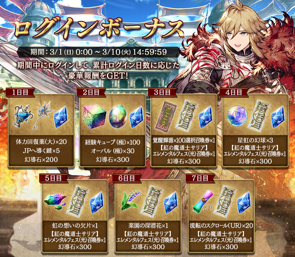 ※【紅の魔道士サリア】エレメンタルフェス(光)召喚券は、3月17日(火)14:59以降は使用できません。
