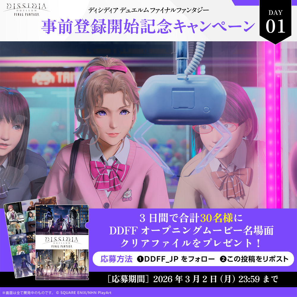事前登録開始を記念して、オリジナルグッズが当たるプレゼントキャンペーンを開催。『ディシディア デュエルム ファイナルファンタジー』公式X アカウント(@DDFF_JP)をフォローして、本日2月26日(木)から2月28日(土)まで毎日投稿される対象ポスト(計3回)を各応募期間までにリポストした方の中から抽選で合計30名様(毎日10名様)に、「DDFFオープニングムービー名場面クリアファイル」をプレゼントいたします。